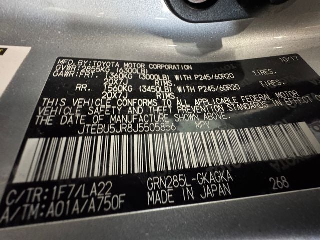 1 OWNER, 3RD ROW !!!, 4WD, Black Graphite Leather, Auto-Dimming Rear-View Mirror, Body Color Heated Mirrors, Garage Door Opener, Limited Package, Moonroof w/Tilt Up & Slide, Right & Left Individual Air Conditioner. Classic Silver Metallic 2018 Toyota 4Runner Limited 4WD 5-Speed Automatic with Overdrive 4.0L V6 SMPI DOHC